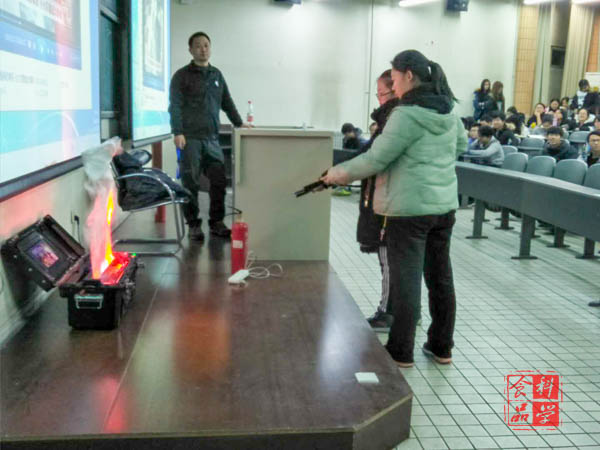 李老师带来了灭火器和模拟火源,在具体讲解了灭火器的种类、使用方法等知识之后,他亲自为大家演示了如何使用灭火器,并且让同学们两人一组上台亲身体验了灭火的过程。