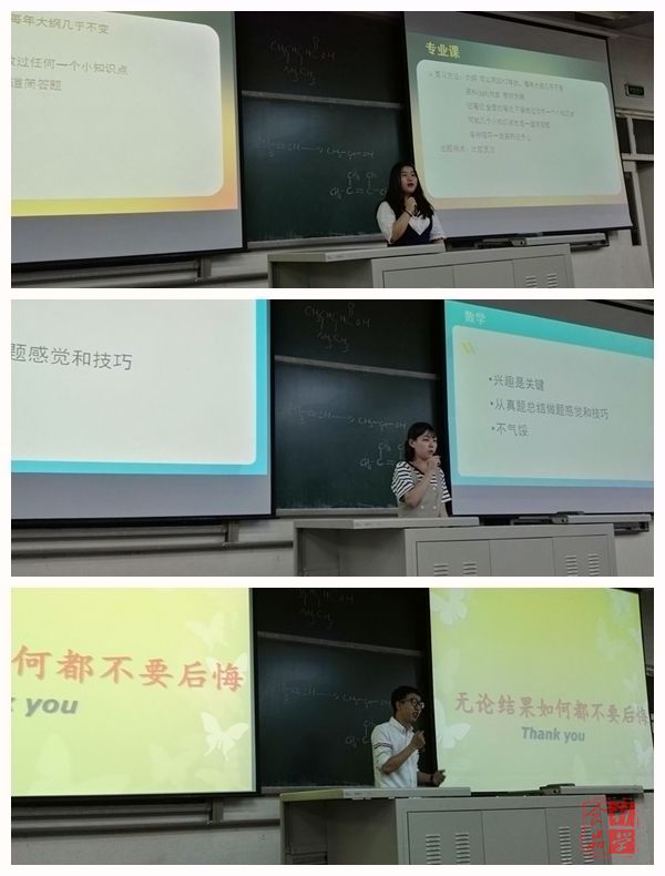 学院还邀请2013级考研学生代表李爽、闫忻莹、刘思佳三位同学分享了自己的考研经验。三位同学从备考的心理准备,院校专业选择,政治、英语、数学、专业课的复习经验,心得体会等几方面向同学们做了深入细致的分享。