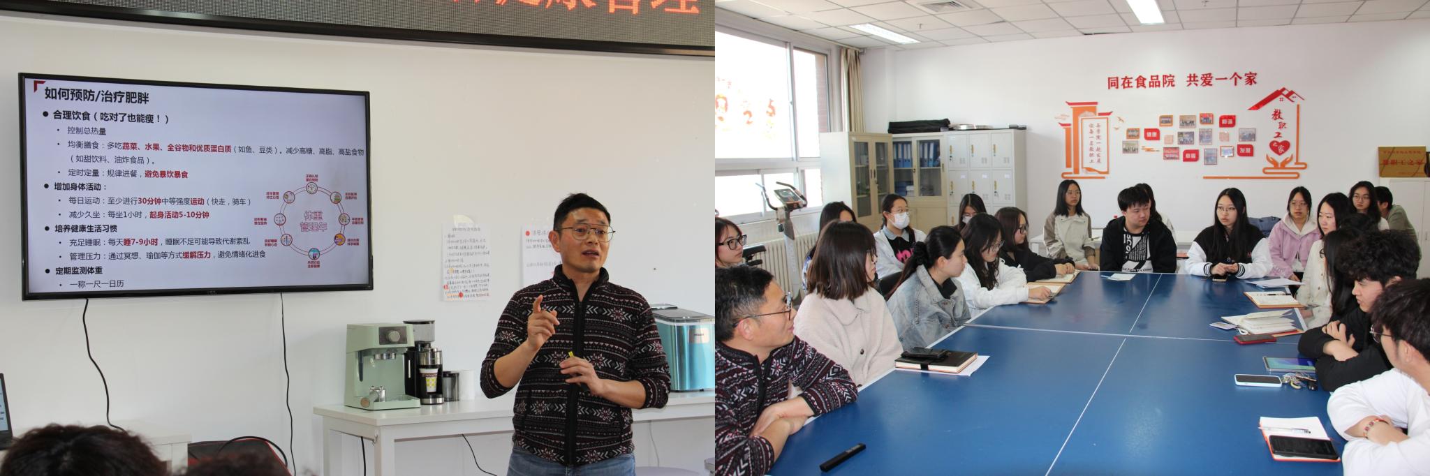 活动特别邀请了李相阳老师作为分享嘉宾。他结合“两会”期间关于健康管理的重要讲话精神,深入浅出地为同学们讲解了健康管理的重要性。他指出,学生在专注学业的同时,要做好健康与体重管理。围绕BMI指数、合理饮食、科学运动、压力管理和健康减重等方面展开了详细的知识分享。他强调了膳食宝塔在日常饮食中的重要地位,提醒同学们关注膳食纤维、蛋白质、健康脂肪的摄入,以及不同人群的特殊营养需求。此外,还生动地阐述了运动对他个人健康的多重益处,包括增强自信心、提升积极面对问题的能力以及培养坚定的信念等。