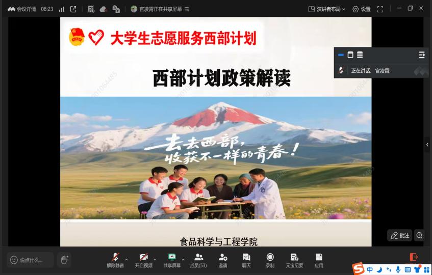 会议上,官凌霄对西部计划的政策文件展开系统解读,并结合食品专业,剖析专业知识与志愿服务的契合点,助力同学们迅速掌握西部计划的专项信息,明晰服务方向。随后,贾博文从政策细节、报考流程、注意事项以及发展前景等维度进行专业讲解,并对同学们提出的问题予以耐心解答。
