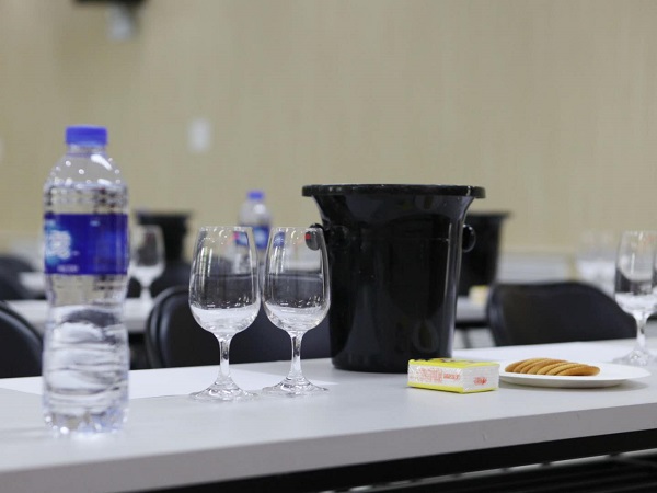 讲解环节结束后,活动进入备受期待的品酒环节。李德美老师首先为大家介绍了葡萄酒品鉴时端酒杯的正确姿势,现场吐酒桶、白纸、矿泉水和原味饼干的功用。大家边学习边模仿,跃跃欲试。