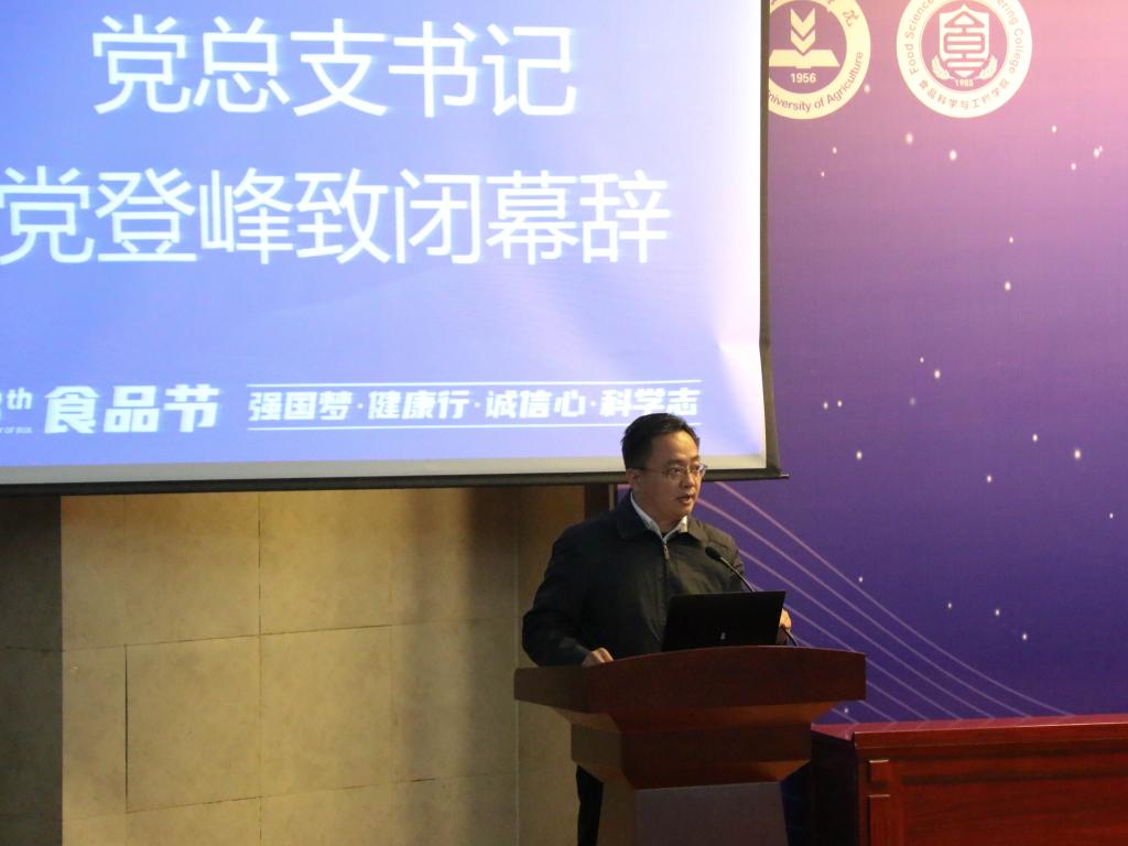 最后,学院党总支书记党登峰致闭幕辞。党书记首先感谢所有在抗疫工作和食品节筹备中辛苦付出的师生们,对食品节获奖师生表示祝贺。随后,党书记从责任与担当、创新与发展等方面分析了食品行业未来的机遇和挑战,激励师生要有责任担当和家国情怀,在抗疫和专业中有所作为。特别是大一新生们,要在学长打下的坚实基础上,努力学习、勤于实践,让第14届食品节办得更好。