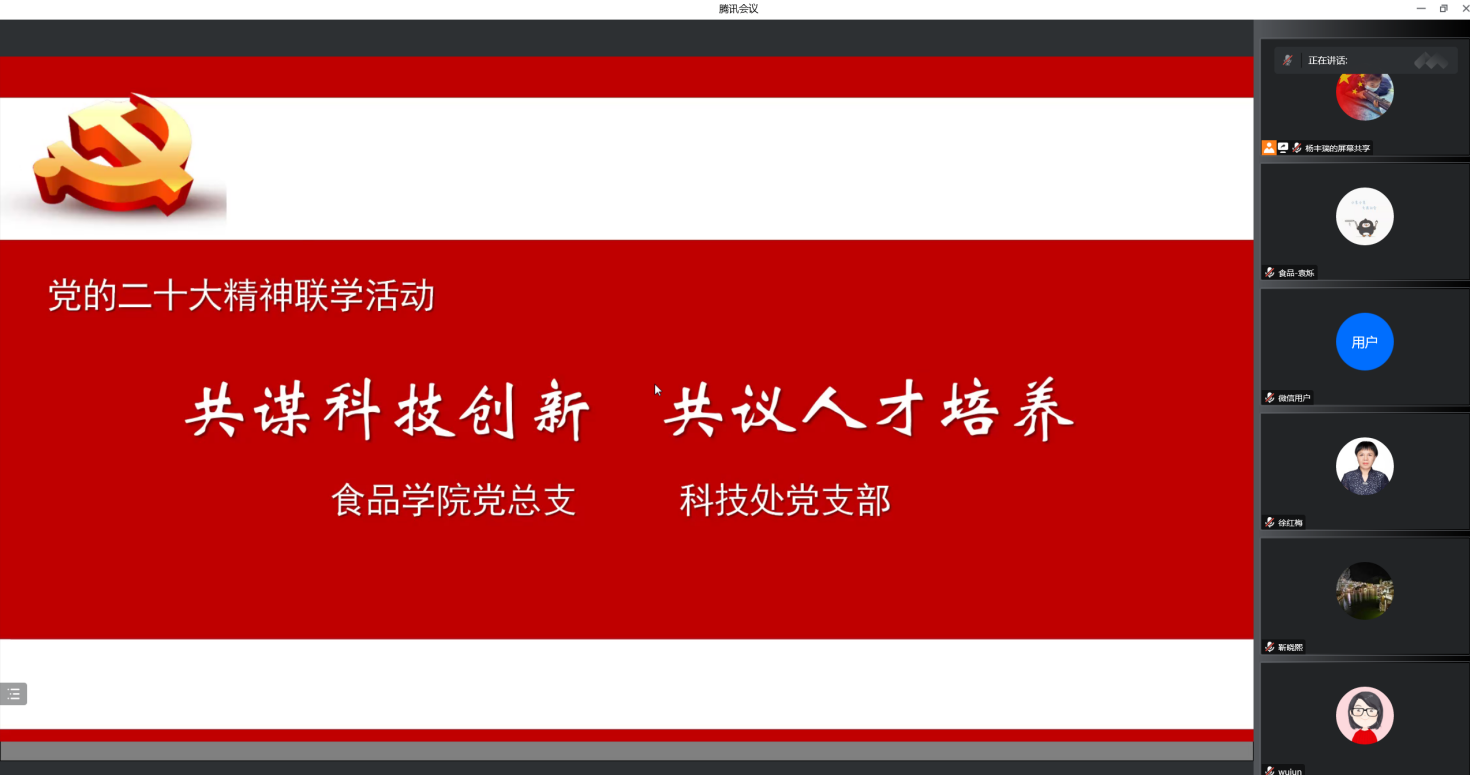12月7日下午,开云手机站登录入口党总支与科技处党支部开展党的二十大精神联学活动,围绕“共谋科技创新,共议人才培养”主题,就教育、科技、人才专章进行集体学习。会议由食品学院党总支书记靳晓熙主持。开云手机站登录入口与科技处全体教职工参会。
