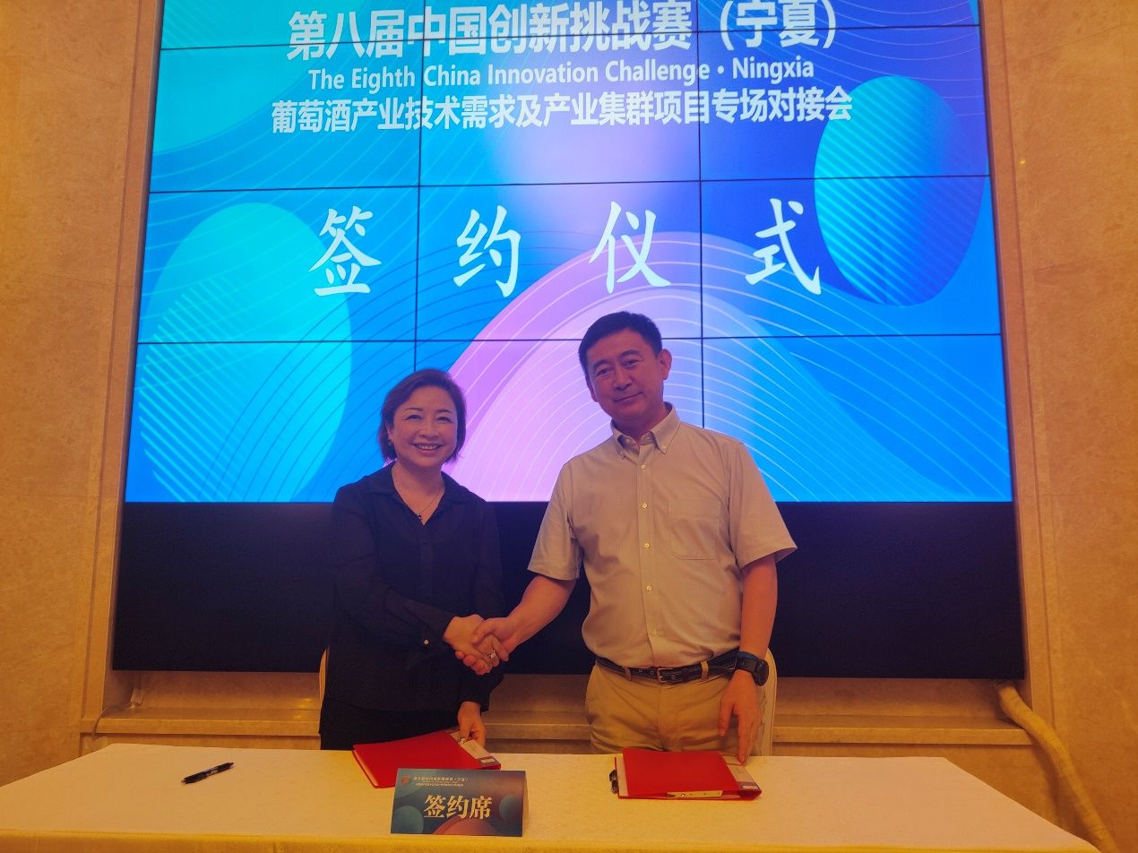 中国创新挑战赛(宁夏)由科学技术部火炬高技术产业开发中心、宁夏回族自治区科学技术厅、宁夏贺兰山东麓葡萄酒产业园区管理委员会联合主办。会议现场发布了“葡萄酒国产优质酿酒酵母的引进及应用”“苹乳发酵过程缓慢或终止发酵的研究”等32项技术创新需求。期间,李德美代表团队针对4项需求开展了“中国干旱地区酒庄葡萄酒生产技术集成”的路演报告,展示了北京农学院在葡萄酒产业技术领域的研究成果和创新实力。宁夏产区多个酒庄对团队的研究技术表达了合作意向。团队与宁夏长和翡翠酒庄有限公司签署了合作协议,内容涵盖葡萄种植、酿酒技术、市场推广等多个领域。双方共同致力于推动葡萄酒产业的发展和创新,为产业的跨界合作注入了新动力。