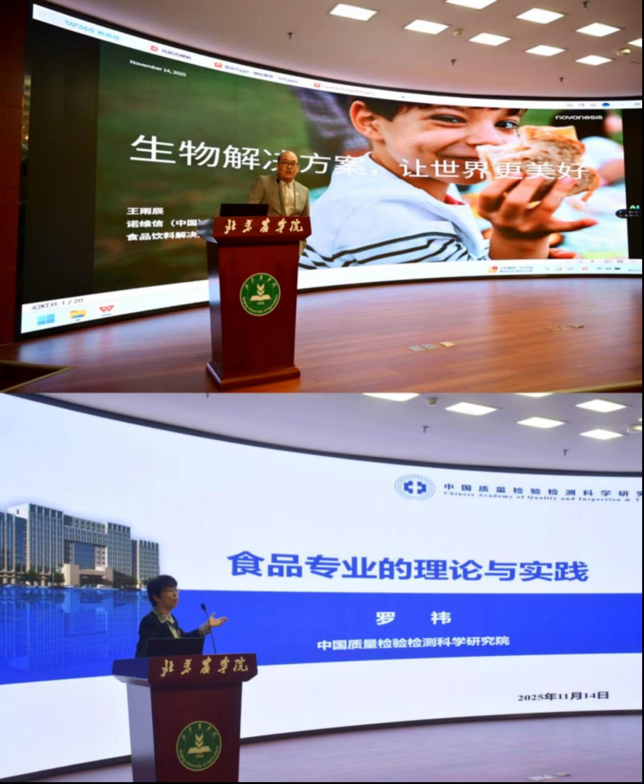 学院特邀诺维信(中国)投资有限公司研发经理王雨辰、中国质量检验检测科学研究院副研究员罗祎,分别围绕“生物解决方案 让世界更美好”“食品专业的理论与实践”作主题报告。同学们纷纷表示收获颇丰、受益匪浅,不仅对行业发展态势与自身未来职业路径有了更深刻的思考与清晰规划,更对“科技赋能产业”有了更鲜活、立体的认知,同学们的专业认同感、行业自信力得到进一步提高,激发了投身专业领域、深耕学术科研的学习热情。