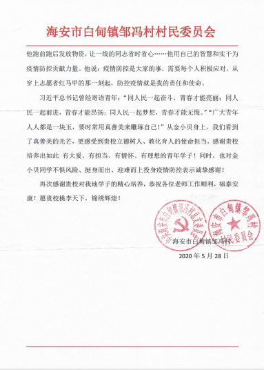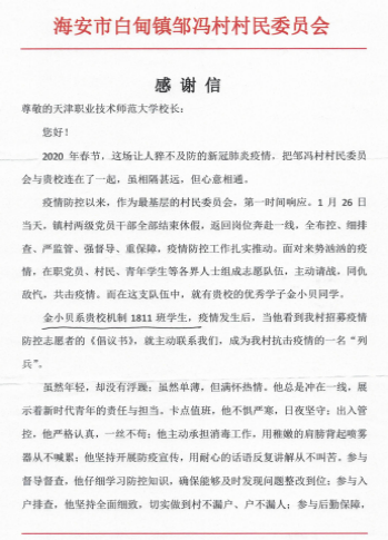 机制1811班学生金小贝同学在疫情防控期间主动请战,冲在一线,成为抗击疫情的一名“列兵”,展示着新时代青年的责任与担当。机自1803刘志婷在家乡疫情防控中,奉献了青春和汗水,彰显了青春责任和担当。工业1701崔迪帅外出游玩时遇到陌生女孩落水,奋不顾身跳入水中救起女生。机自1702吴选明帮助家乡脱贫攻坚贡献力量,受到当地的通报表扬。类似的学生有很多,学生在学校、社会充分展现了青年学子的奋斗、责任与担当,也是我院学生思想政治教育的鲜活案例。