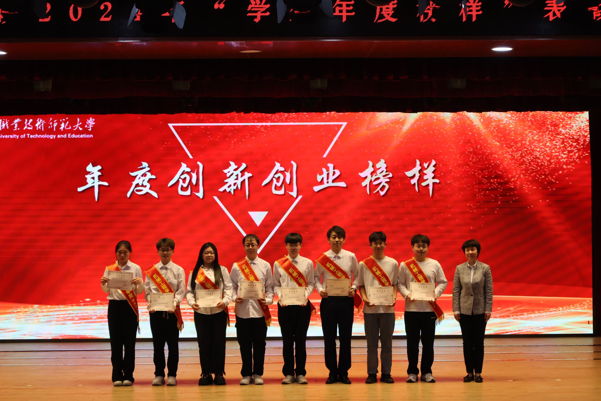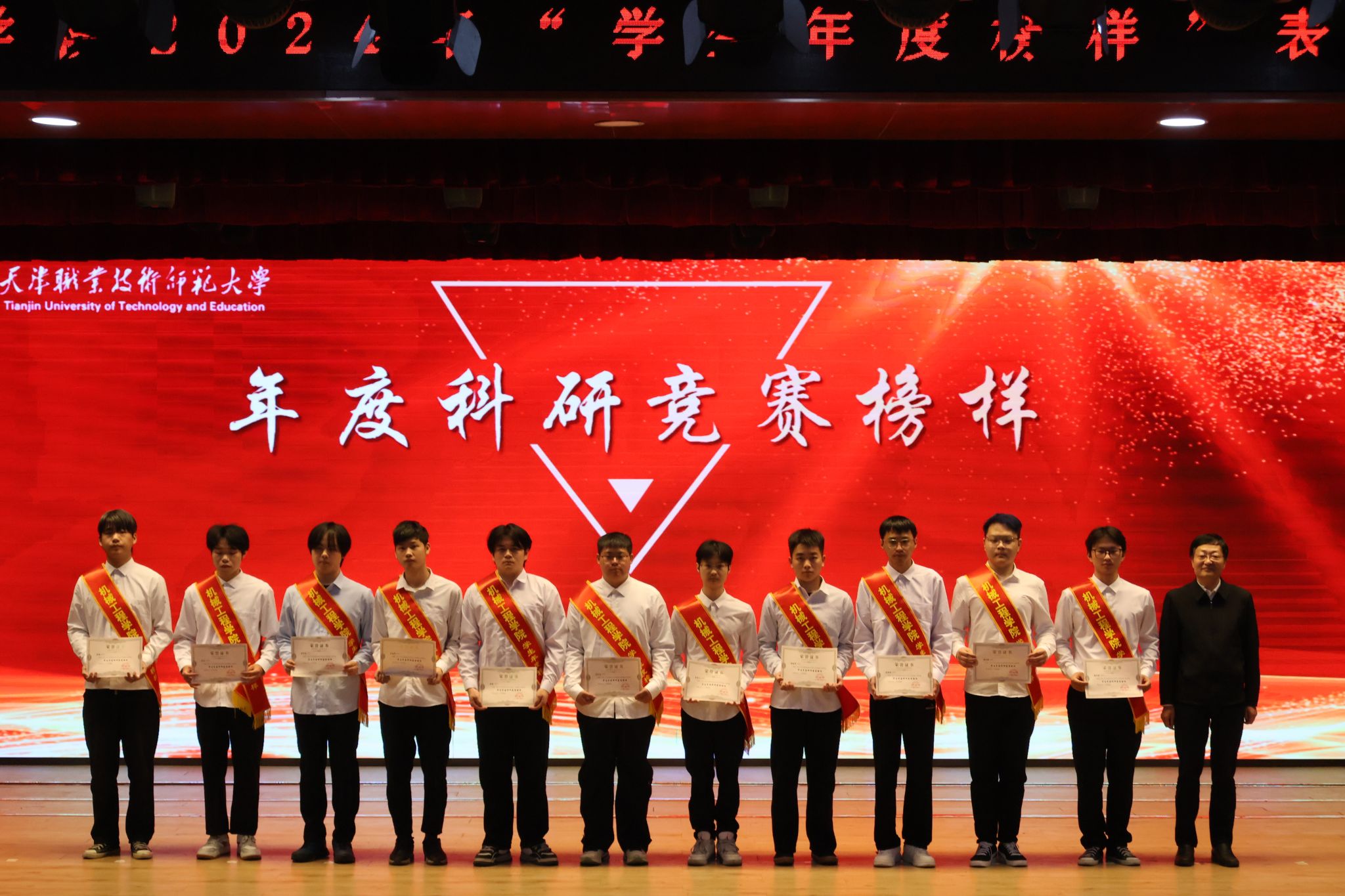 学院院长戚厚军宣读表彰决定,为学院2024年在学习学业、科研竞赛、创新创业、文体活动和志愿奉献五个方面取得突出成绩的60名先进个人授予机械工程学院“学生年度榜样”称号。与会领导为“学生年度榜样”颁发证书。