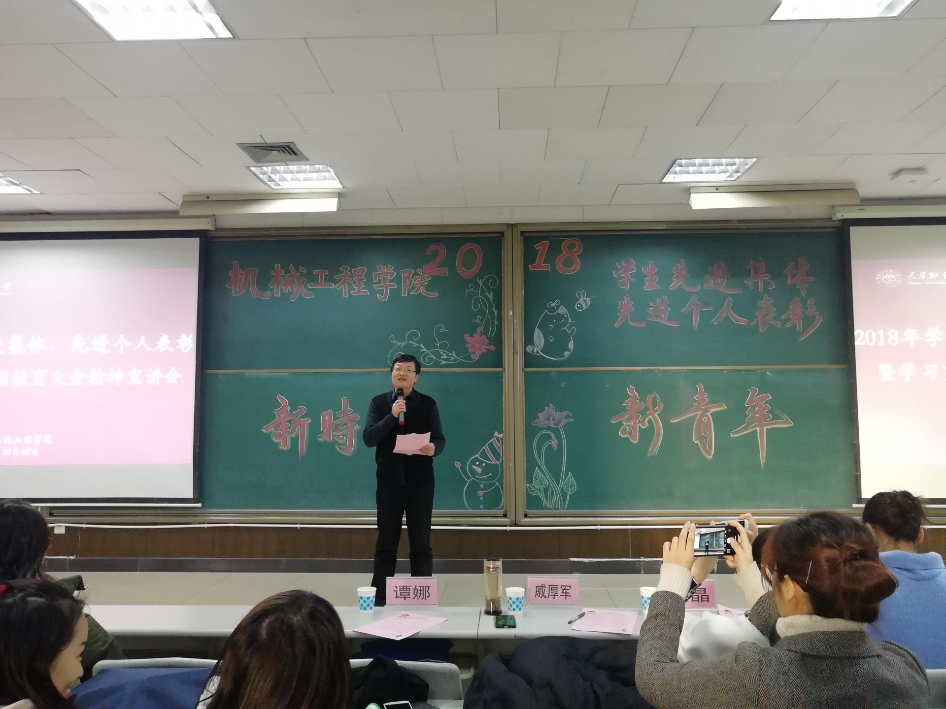 2018年12月28日,机械工程学院召开2018年度学生先进集体、先进个人表彰会暨学习贯彻全国教育大会精神宣讲会,学习贯彻落实全国教育大会精神,表彰表现突出的集体和个人。学院副院长戚厚军、院党委副书记刘晶出席会议,全体辅导员、教务科谭娜老师,先进集体代表、先进个人代表以及学生代表参加会议。会议由院团委书记戚霄主持。