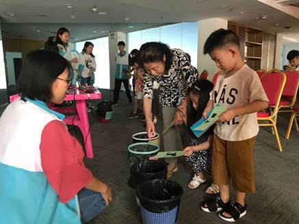 实践团队根据社区居民特点,精心准备了“垃圾分类知识推广”系列活动。实践团队在社区广场放置了宣传展板,实践团队队员刘冰洁同学从垃圾分类的意义、方法和途径向社区居民普及垃圾分类知识,通过宣讲,50余名居民主动带着孩子来到室内参加“垃圾分类小能手”、“变废为宝”及等互动活动。在室内互动环节中,实践团队队员李恬、刘力玮自制教具,并将居民喜闻乐见娱乐节目“奔跑吧兄弟”中垃圾分类游戏“进行了改编,以寓教于乐的形式让参与活动的居民们形象了解分类知识,成为“”分类小能手”;实践团队队员宋春雨则指导居民用废弃的瓶盖制作小灯笼,“变废为宝”的过程让居民们深切感受到“垃圾是放错地方的资源”。