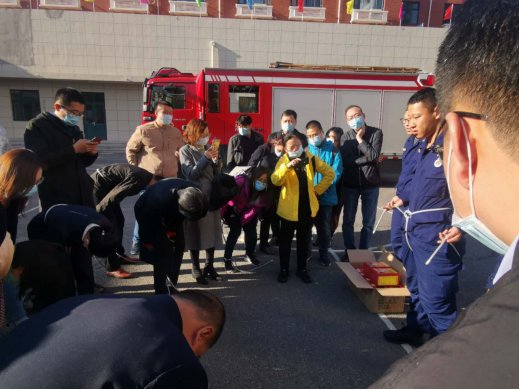 教师们还在消防员的带领下进行现场演练,了解消防车内部的各种消防用品,学习了如何打逃生绳结,学习如何使用消防水带和防毒面具。